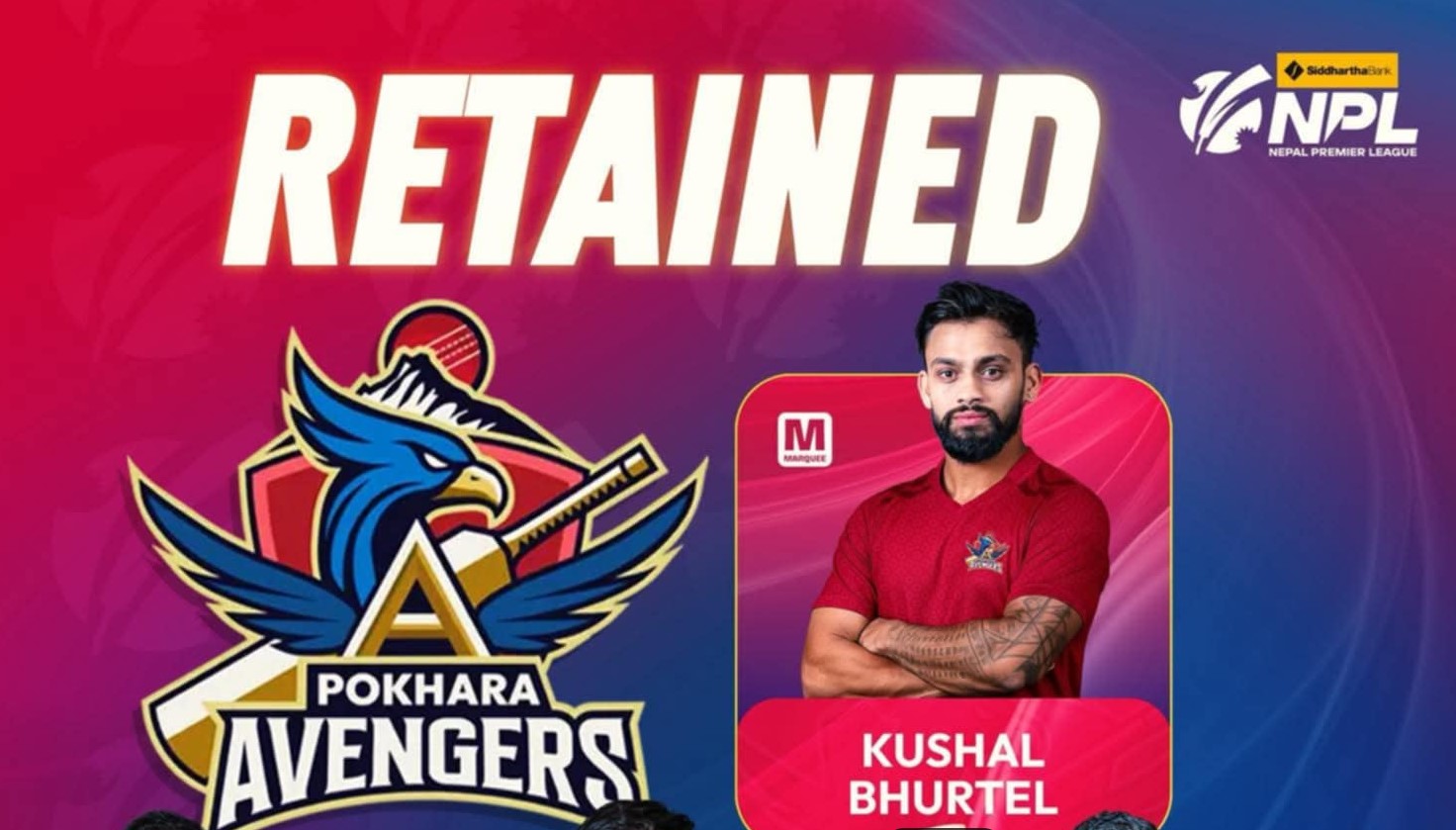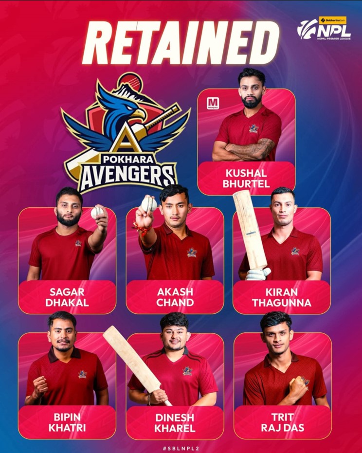 पोखरा । नेपाल प्रिमियर लिग एनपिएलको दोस्रो सिजनका निम्ति पोखरा एभेन्जर्सले मार्की खेलाडी कुशल भुर्तेलसहित सातजनालाई रिटेन गरेको छ ।