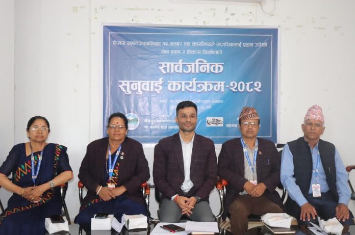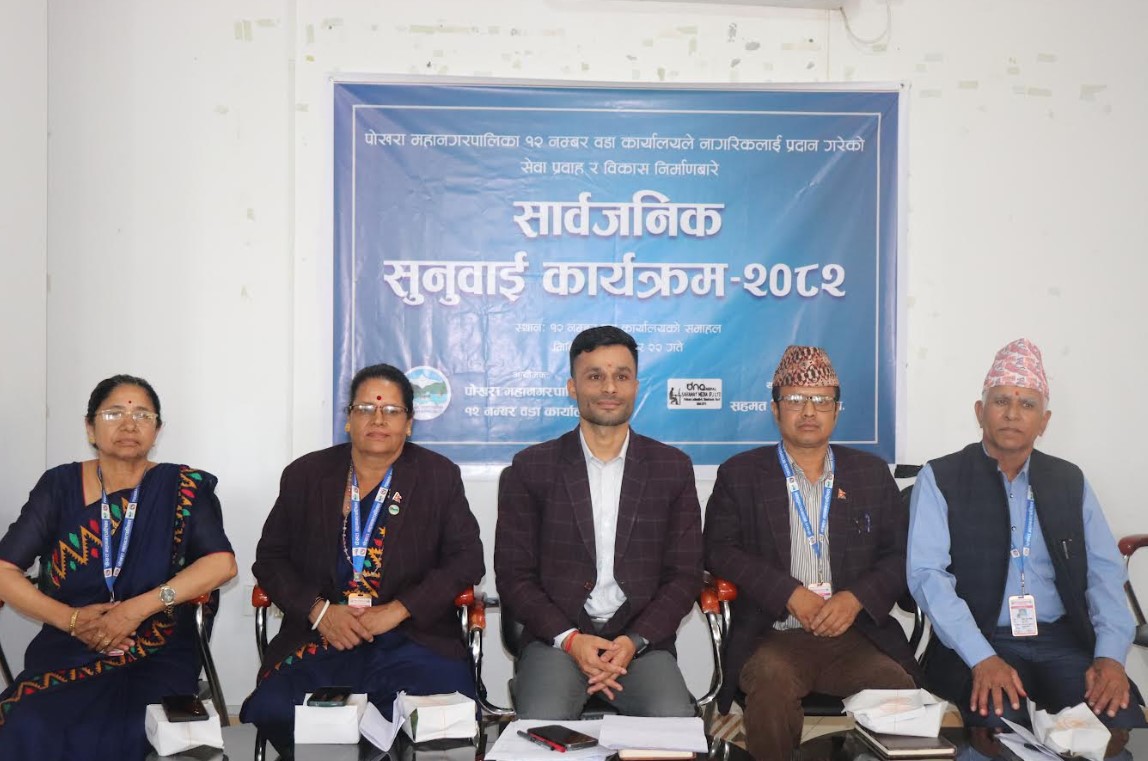पोखरा । पोखरा महानगरपालिका वडा नम्बर १२ ले चालू आर्थिक वर्ष २०८१।०८२ को सार्वजनिक सुनुवाइ गरेको छ । वडा कार्यालयले प्रदान गर्ने सेवा प्रवाह र विकास निर्माणका विषयमा जानकारी दिने र सेवाग्राहीबाट सुझाव लिने उद्देश्यले कार्यक्रम आयोजना गरिएको हो । कार्यक्रममा वडाभित्र भएका विकास निर्माणका कामको सबैले प्रशंसा गरेका छन् । तर सेवा प्रवाहका विषयमा भने केही गुनासो नागरिकहरुले गरेका छन् । उनीहरुले शिक्षा, स्वास्थ्य, पूर्वाधार, युवा परिचालन र सामाजिक विकृति नियन्त्रणजस्ता विषयमा प्रश्न उठाएका थिए ।