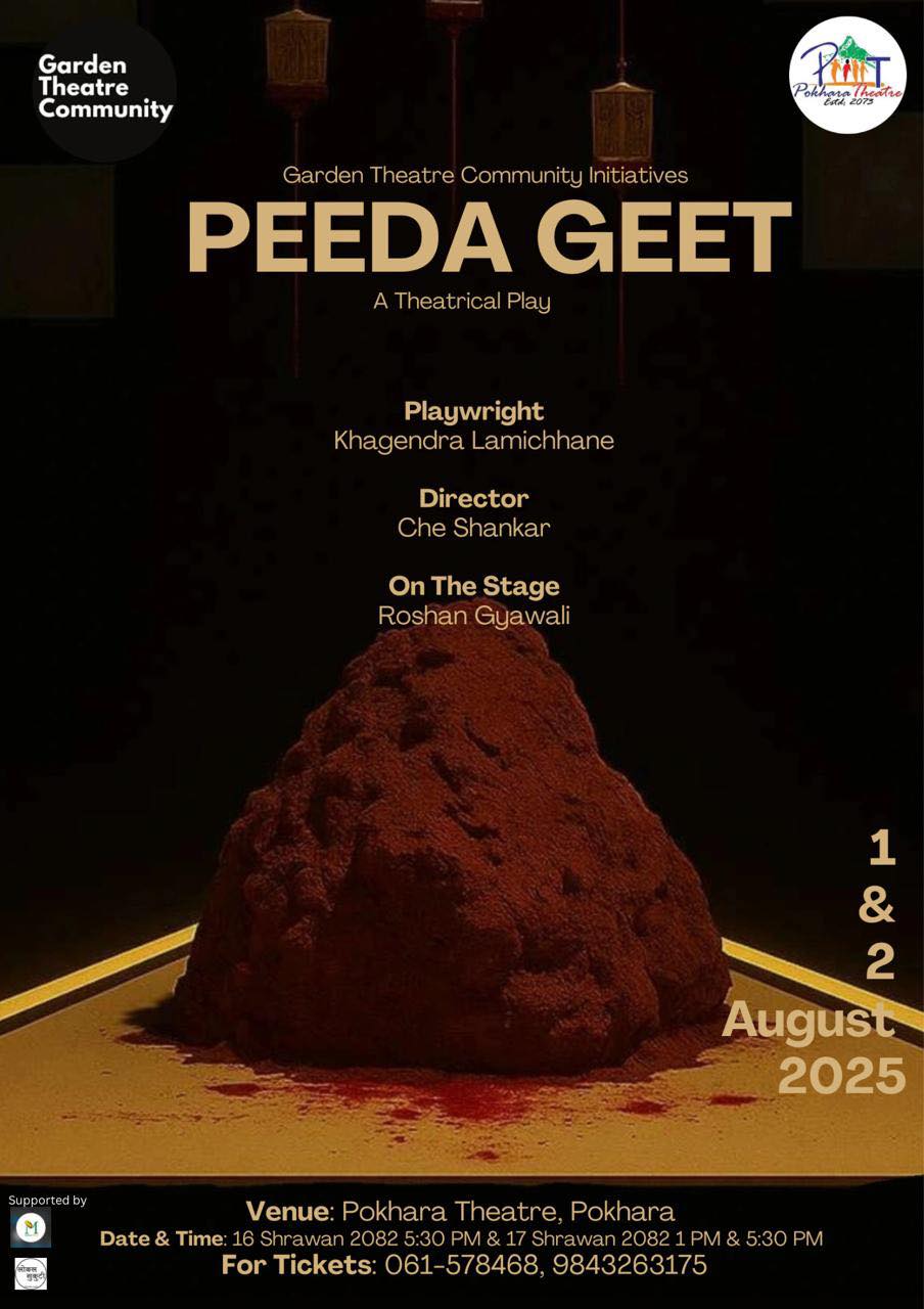 पोखरा । नाटक ‘पीडा गीत’ पोखरामा मञ्चन हुने भएको छ । खगेन्द्र लामिछानेद्वारा लिखित यो नाटक पोखरा थिएटरको गन्धर्व नाटकघरमा मञ्चन हुन लागेको हो । नाटकलाई रङ्गकर्मी चे शंकरले निर्देशन गर्दैछन् । सन् २०१२ मा ‘इलुजन’ नाटक निर्देशन गरी नाट्य क्षेत्रमा डेब्यु गरेका चे शंकरले हालसम्म दुई दर्जन बढी नाटक निर्देशन गरिसकेका छन् । उनको निर्देशनमा यस अगाडि पोखरामा ‘उ मरेकी छैन’ र ‘तिर्खा’ नाटक मञ्चन भएको थियो ।