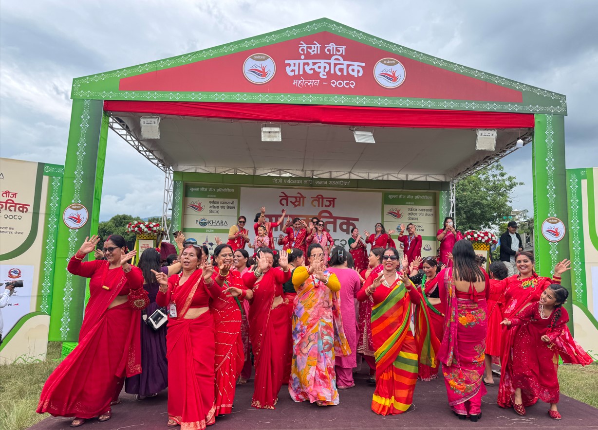 पोखरा । पर्यटन व्यवसायी महिला संघ नेपाल (टेवान) को आयोजनामा मङ्गलबारदेखि पोखराको लेकसाइडस्थित बाराहीघाट चौरमा ‘तेस्रो तीज सांस्कृतिक महोत्सव–२०८२’ सुरु भएको छ । हरितालिका तीजको अवसरमा आयोजित महोत्सवको उद्‌घाटन गण्डकी प्रदेशका सामाजिक विकास, युवा तथा खेलकुदमन्त्री बिन्दुकुमार थापाले गरे ।
