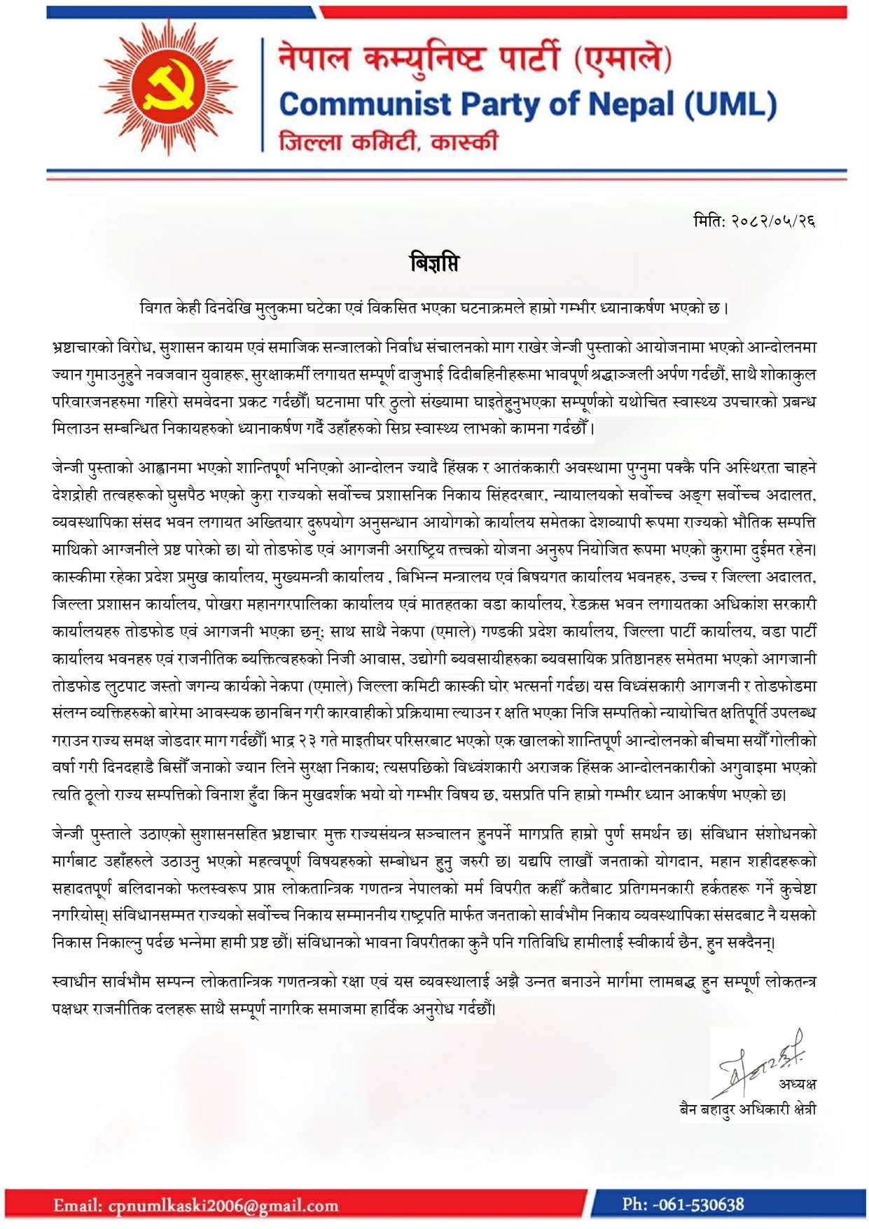 जेनजीको आन्दोलनका क्रममा पोखरामा संघ, प्रदेश र जिल्लास्थित विभिन्न सरकारी कार्यालयहरु, एमाले गण्डकी प्रदेश कार्यालय, जिल्ला कार्यालय, वडा पार्टी कार्यालय, राजनीतिक व्यक्तित्हरुको निजी आवास, उद्योगी व्यवसायीका व्यापारिक प्रतिष्ठानहरुमा भएको तोडफोड, लुटपाट र आगजनीको घोर भत्र्सना गरिएको छ ।