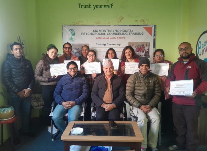 पोखरा । हार्ट माइन्ड कन्सल्टेन्सी पोखराले सञ्चालन गरेको ६ महिने मनोसामाजिक, मनोविमर्शको तालिम १६  जनाले पुरा गरेका छन् । तालिम अन्तर्गत  दोश्रो र तेश्रो व्याजका गरेर  १६ जनाले मनोविमर्शको तालिम पुरा गरेका हुन् ।  तालिम ६ महिना अर्थात ७ सय ८० घण्टा पुरा भए पछि शनिवार एक कार्यक्रमको आयोजना गरि संस्थाले प्रमाणपत्र बितरण र अनुभव आदान प्रदान गरि तालिम लिएकाहरूलाई बिदाई गरेको हो ।
