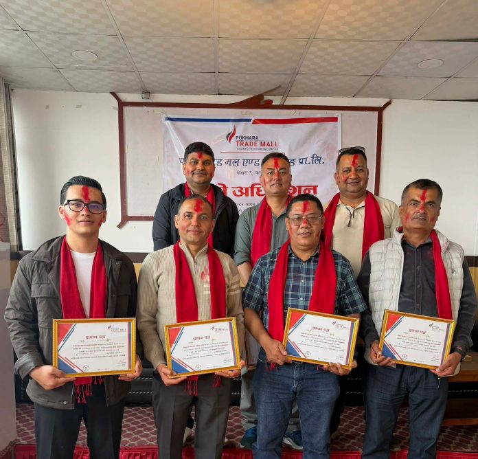 पोखरा। पोखराको व्यावसायिक क्षेत्रलाई गतिशील बनाउँदै आएको पोखरा ट्रेड मलमा नयाँ सञ्चालक समिति चयन भएको छ। नवगठित समितिले संस्थाको समग्र व्यवस्थापन, सेवा विस्तार तथा ग्राहकमैत्री वातावरण निर्माणलाई प्राथमिकतामा राख्दै काम अघि बढाउने प्रतिबद्धता जनाएको छ। नयाँ सञ्चालक समितिमा अध्यक्षमा दीपक कुमार मुल्मी, प्रबन्ध निर्देशकमा सौगात थापा तथा सदस्यहरूमा सन्तोष कुमार घिमिरे, शिव शर्मा, राम कुमार श्रेष्ठ, नगेन्द्र प्रसाद पोखरेल र हरिश चन्द्र तिवारी चयन भएका छन्।