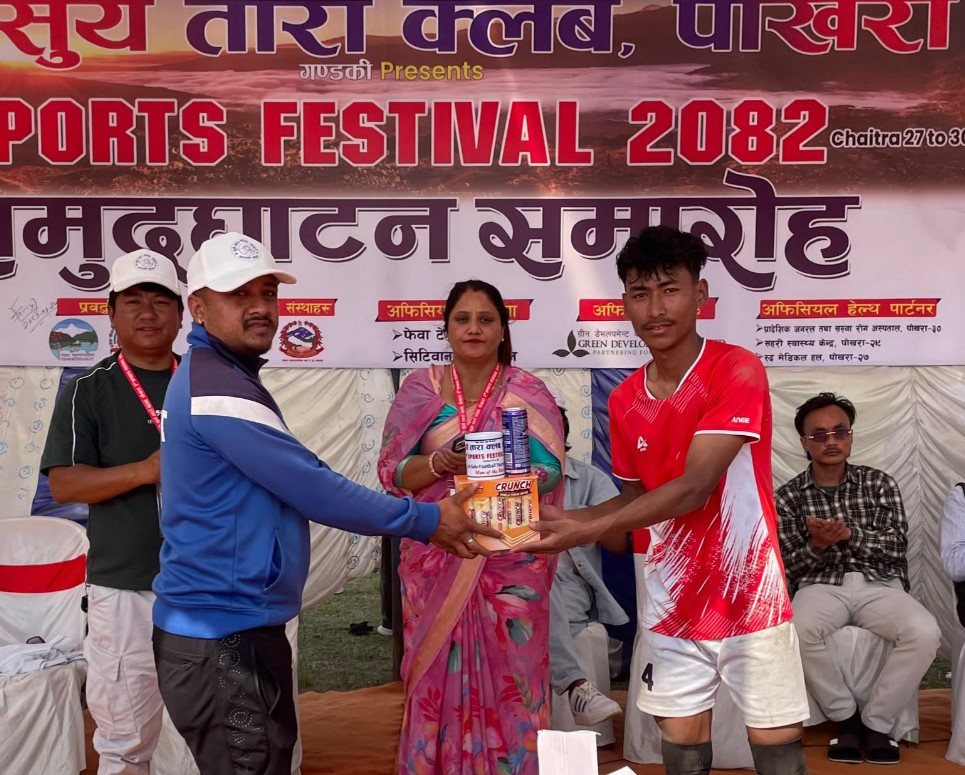 पोखरा । शुक्रबारबाट सुरु भएको ‘तेस्रो सूर्यतारा खेल महोत्सव २०८२’ अन्तरगत शनिबार पुरुष सेभेन ए साइड फुटबल प्रतियोगिताका ७ खेल सम्पन्न भएका छन् । प्रचार प्रसार संयोजक ईश्वर अधिकारीले दिएको जानकारी अनुसार शनिबारको भ्यु पोइन्ट एफ सी र आर एस पोखरा एफ सी बीचको पहिलो खेलमा पेनाल्टी सुट आउटमा आर एस पोखरा विजयी भयो । निर्धारित समयमा २–२ गोलको बराबरी भएपछि खेल पेनाल्टी सुटआउटमा पुग्यो । पेनाल्टी सुटआउटमा आर एस ३–२ गोल अन्तरले विजयी भएको हो । यो खेलमा आर एस पोखराका सदीस कार्की म्यान अफ दि म्याच घोषित भए ।
