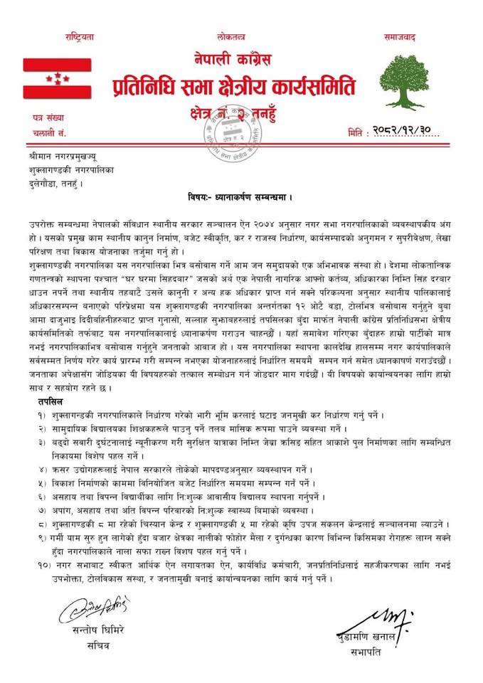 कांग्रेसका क्षेत्रीय सभापति चूडामणि खनाल र सचिव सन्तोष घिमिरेले सोमबार पत्र बुझाउँदै जनताका गुनासो र आवश्यकताका आधारमा विभिन्न माग अघि सारेका हुन् । नगरपालिकाले निर्धारण गरेको भारी भूमि करलाई घटाएर जनमुखी बनाउनुपर्ने माग पत्रमा उल्लेख छ । त्यस्तै सामुदायिक विद्यालयका शिक्षकले पाउनुपर्ने तलब मासिक रूपमा पाउने व्यवस्था गर्न कांग्रेसले माग गरेको छ ।