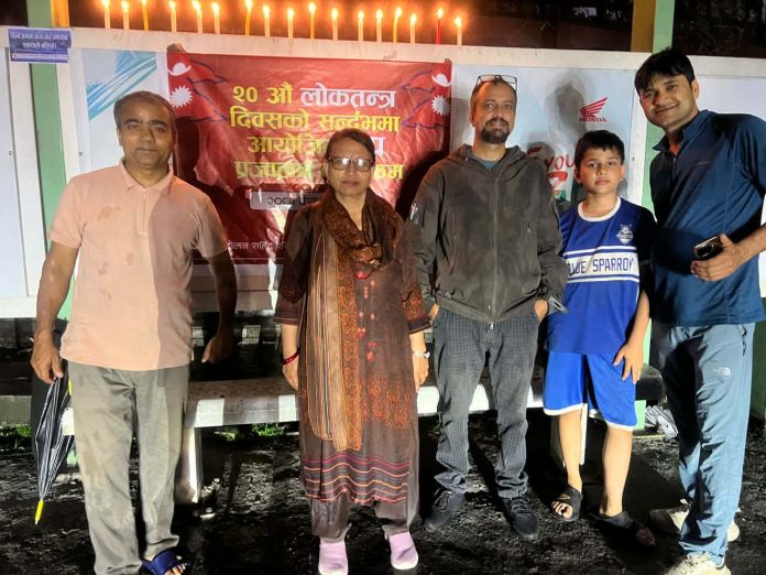 पोखरा । २० औं लोकतन्त्र दिवसको अवसरमा पोखराको सहिदचोकमा दीप प्रज्वलन कार्यक्रम आयोजना गरिएको छ। जन आन्दोलन शहीद परिवार तथा घाइते समन्वय समिति कास्कीको आयोजनामा शुक्रबार साँझ भएको कार्यक्रममा समितिमा आवद्ध सहित विभिन्न राजनीतिक तथा सामाजिक व्यक्तिहरूको सहभागिता रहेको थियो।